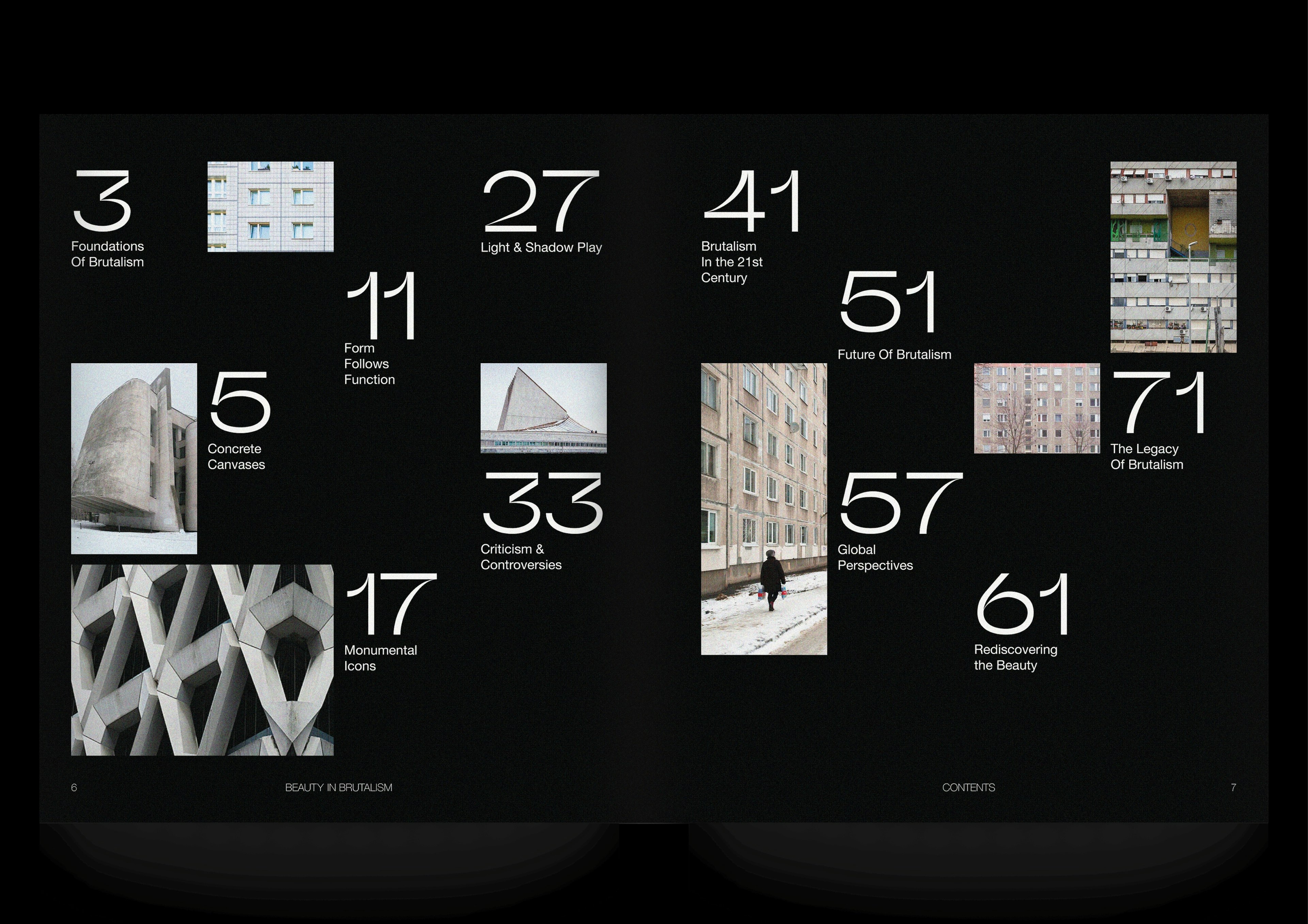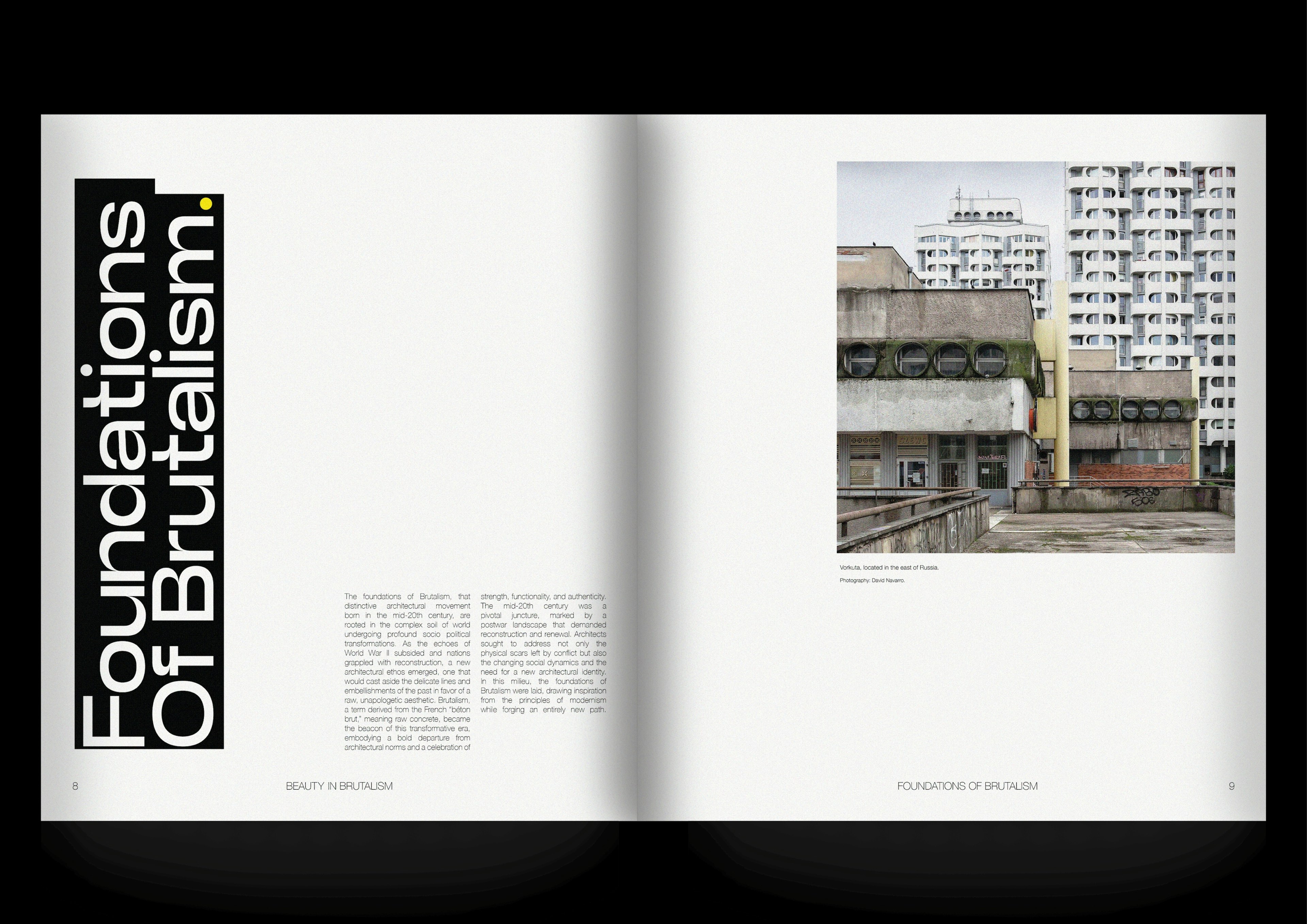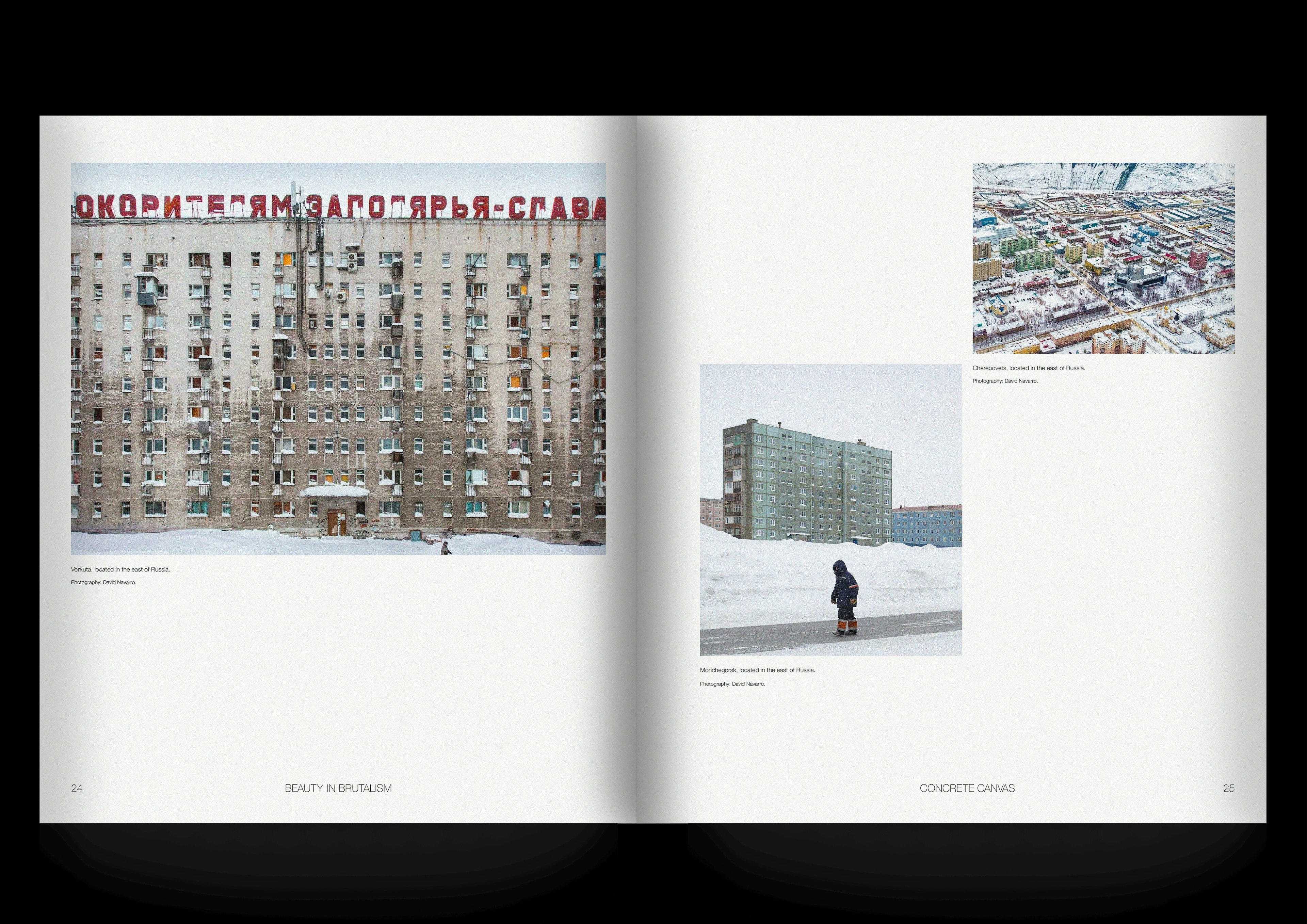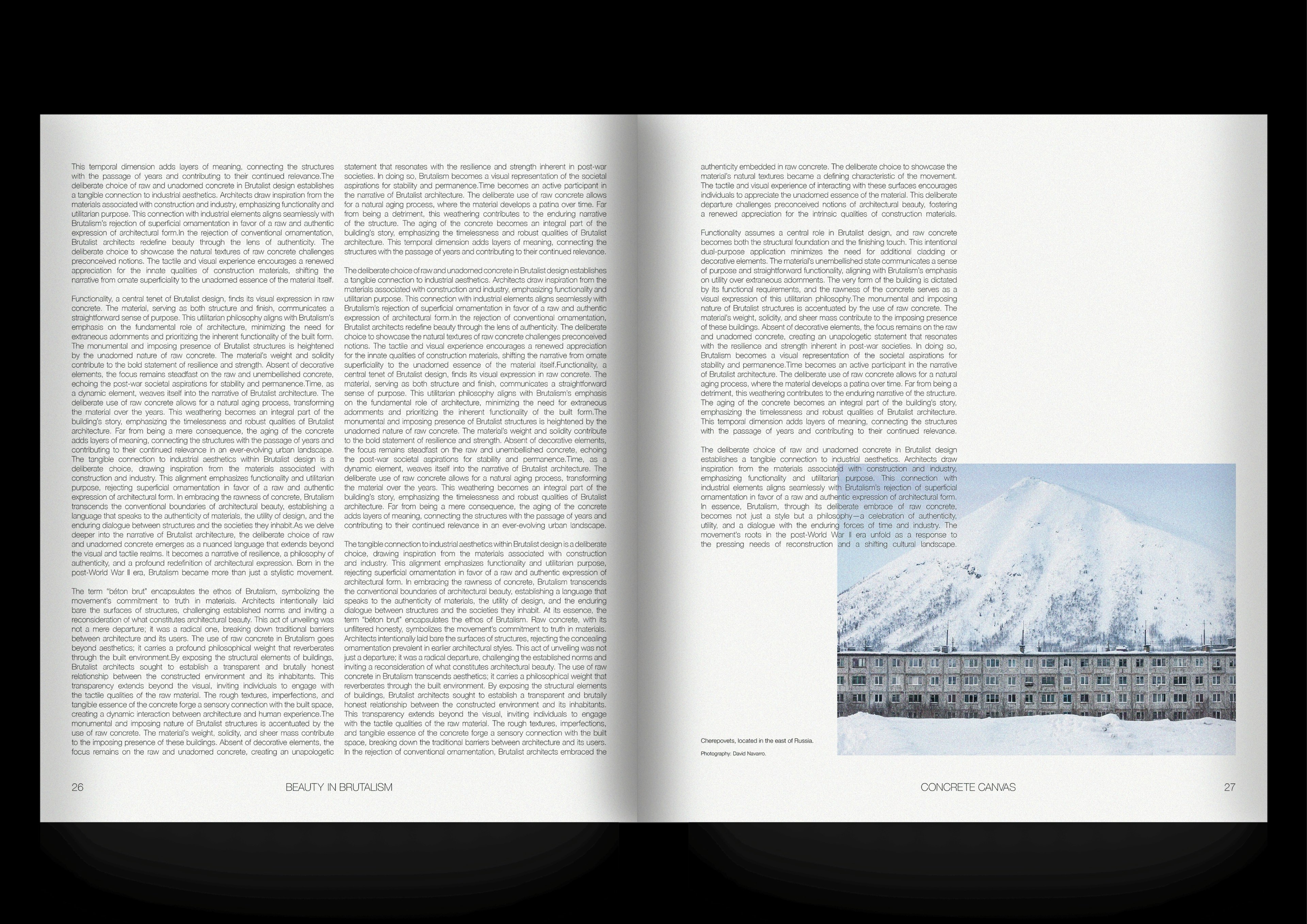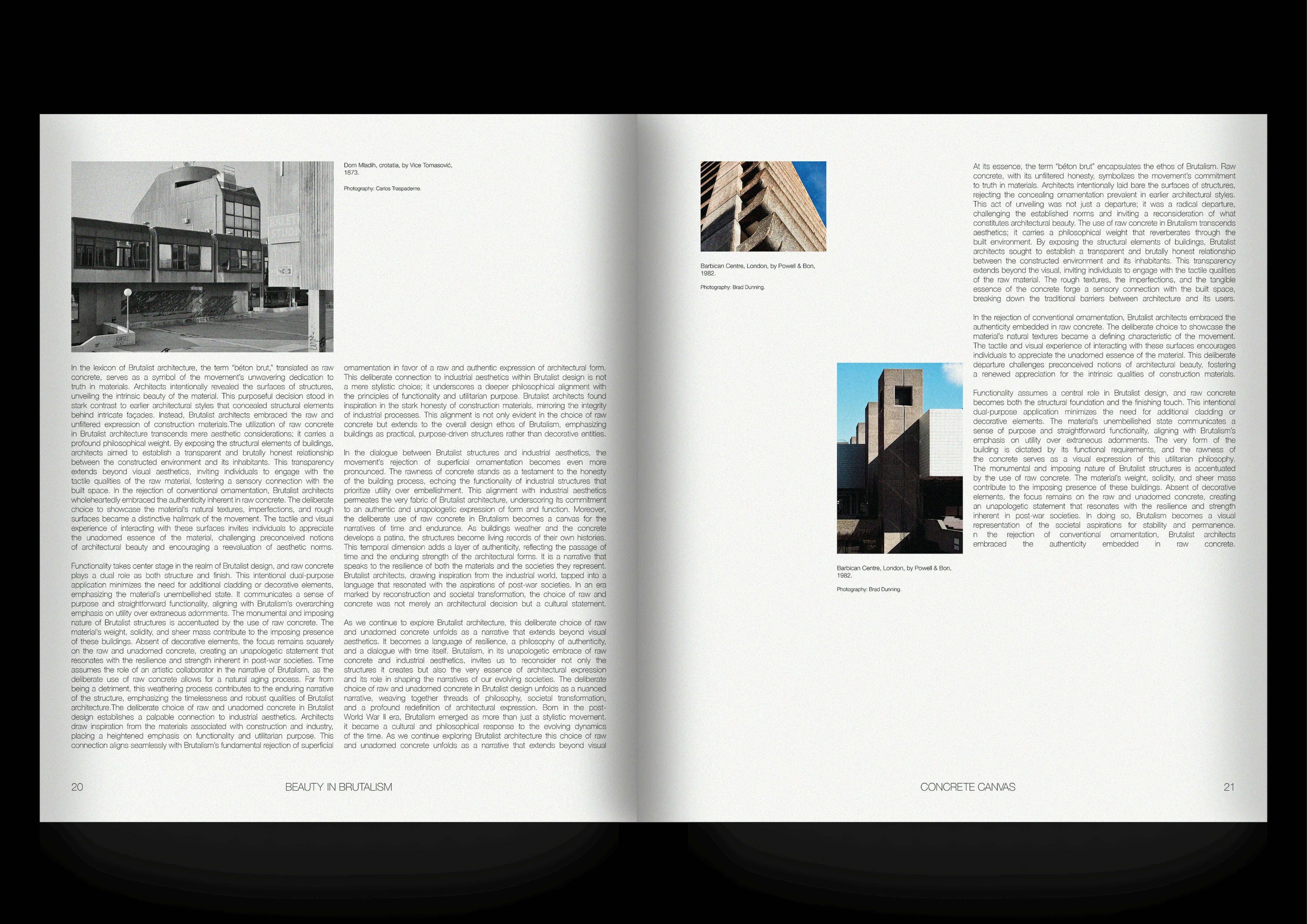 A book which showcases the beauty in the often criticised architectural design movement, Brutalism. The book is designed to imitate the design features from burliest architectural, with a minimalistic yet functional design approach. The cover is made form grey-board with the cover design raster engraved into the material, imitating materials and textured used often within the movement. The book has uses a minimalistic design, with much of the book being image lead, these images are spread around the spreads, strictly following the grid design, imitating the design style of brutalist architecture by being minimalistic, yet functional.The Book includes a raw greybeard cover with the design laser mastered into the material, paying homage to the course materials often used within the architectural movement.